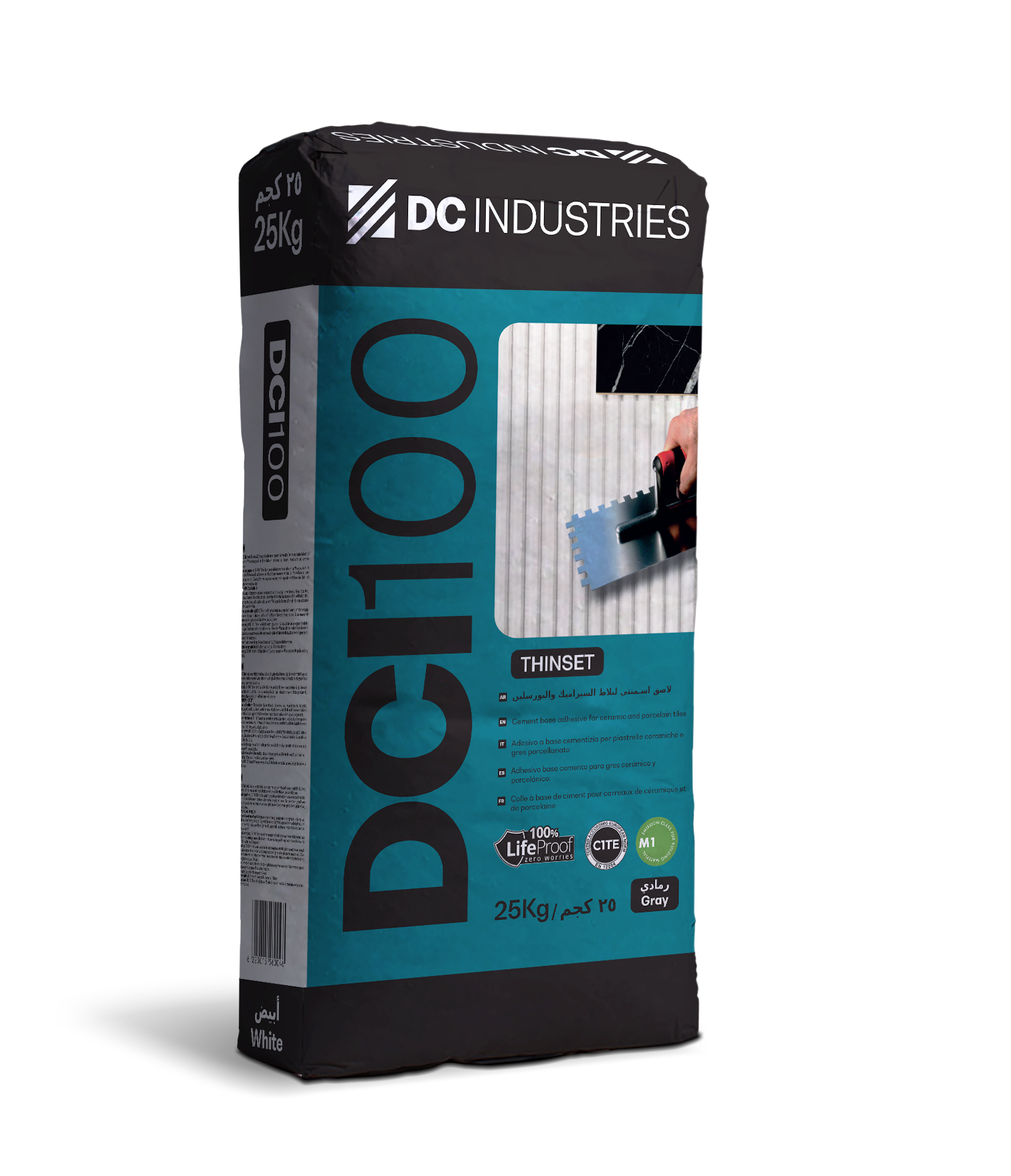 دي سي أي 100 ثينسات عبارة عن مسحوق رمادي أو أبيض اللون مصنوع من الأسمنت والرمل المتدرج المختار والراتنجات الاصطناعية والمواد المضافة الخاصة التي يمكن استخدامها على الجدران والأرضيات لتركيبات الأسطح الرقيقة من البلاط والمواد الحجرية.